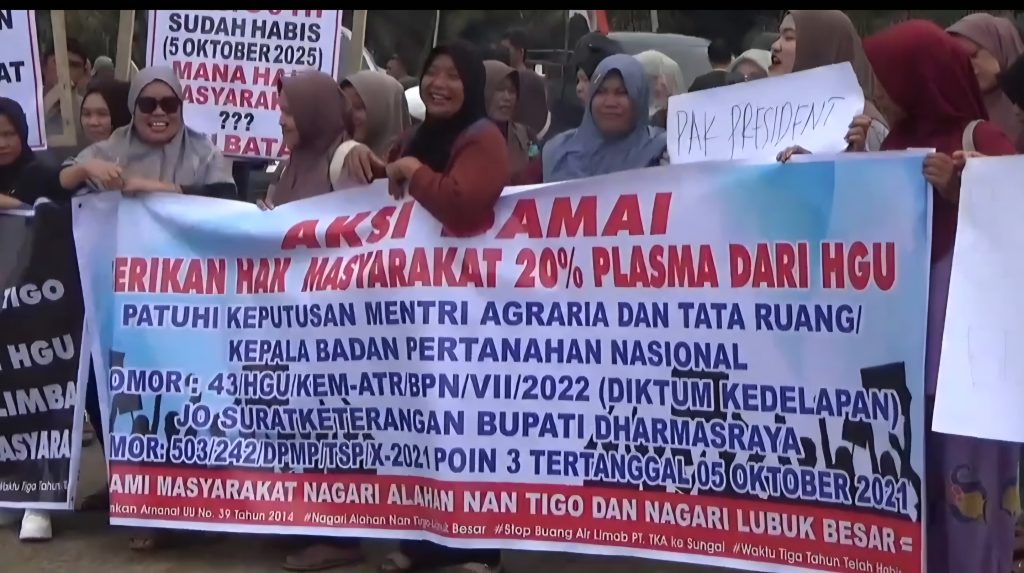 Massa menuntut perusahaan segera merealisasikan pembagian kebun plasma sebesar 20 persen. Tuntutan ini merujuk pada SK Menteri ATR/BPN Nomor 43/HGU/KEM-ATR/BPN/VII/2022 yang menjadi payung hukum kewajiban perusahaan dalam perpanjangan Hak Guna Usaha (HGU).