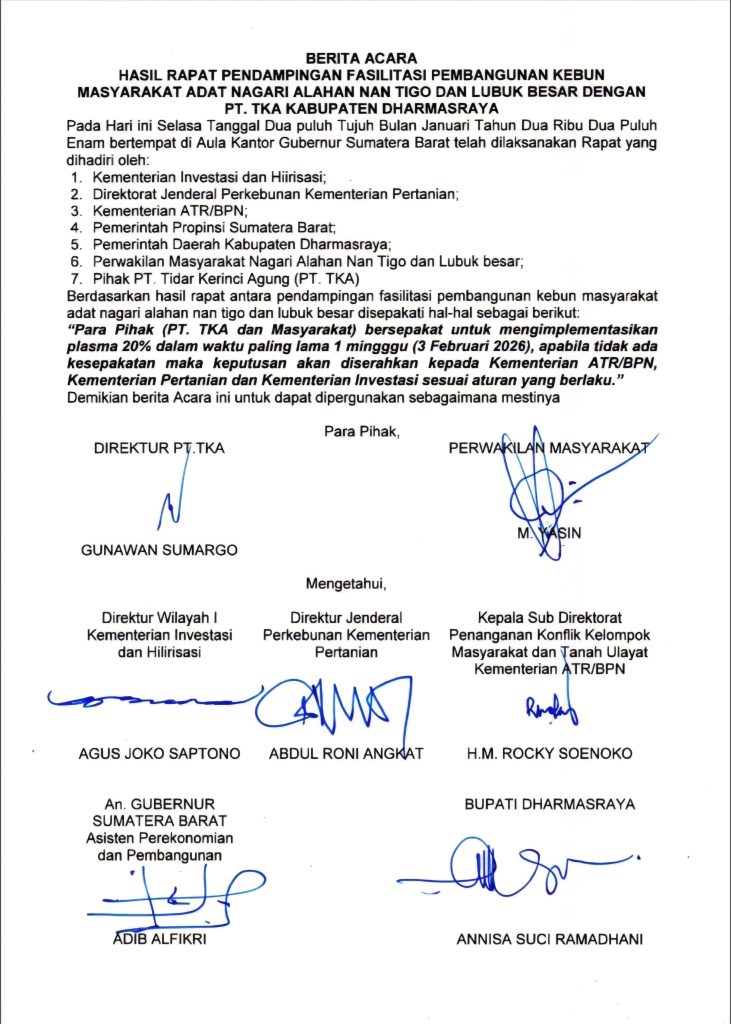 “Dalam pertemuan rapat tersebut menghasil kesepakatan para pihak (PT TKA dan Masyarakat) bersepakat untuk mengimplementasikan plasma 20% dalam waktu paling lama 1 Minggu (3 Februari 2026), apabila tidak ada kesepakatan maka keputusan akan diserahkan kepada Kementerian ATR/BPN, Kementerian Pertanian dan Kementerian Investasi sesuai aturan berlaku,” demikian bunyi poin utama berita acara tersebut.
