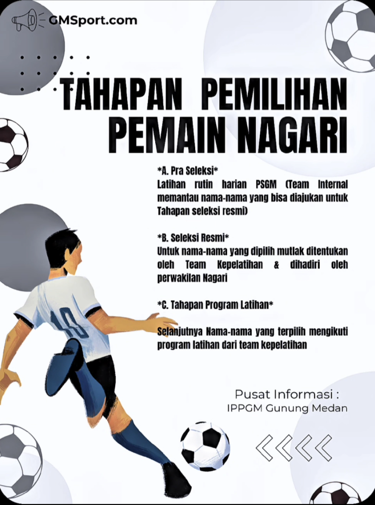 Pengurus Club Sepak Bola Nagari Gunung Medan pada Sabtu (18/4/2026) secara resmi mengumumkan tahapan seleksi bagi talenta sepak bola di Nagari Gunung Medan untuk berpartisipasi.