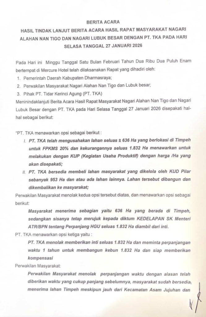 Dharmasraya, Galanggang.id — Masyarakat adat Nagari Alahan Nan Tigo dan Lubuk Besar, Kecamatan Asma Jujuhan, Kabupaten Dharmasraya menagih keseriusan itikad baik perusahaan PT Tidar Kerinci Agung (TKA), terkait kewajiban pembangunan kebun plasma 20 persen, Selasa (3/2//2026).