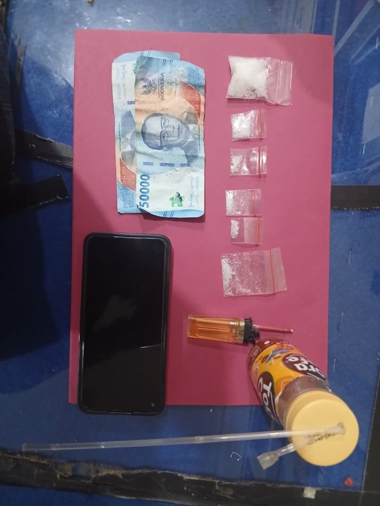 Dari tangan RA, petugas menyita enam plastik klip bening berisi kristal diduga sabu, satu alat hisap (bong) dari botol plastik merek Tora Cafe, satu korek api yang telah dimodifikasi dengan jarum, satu unit handphone merek Redmi warna biru, serta uang tunai Rp100 ribu.